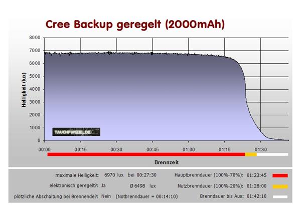 Der Brennchart hingegen zeigt kaum einen Unterschied zu anderen ungeregelten Backuplampen mit drei AA Zellen - wie auch, denn die Ansteuerung der LED ist gleich. Ich persönlich bevorzuge die Elektroniklose Lösung wenn es um reine Backuplampen Zwecke geht, da hier die Robustheit kam zu überbieten ist. Weder elektronisch noch mechanisch kann hier viel ausfalllen. |
